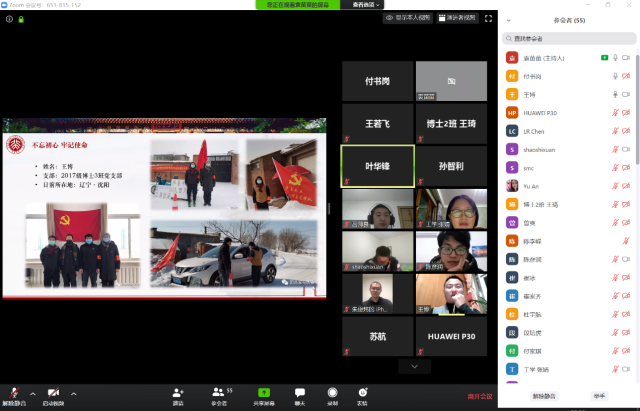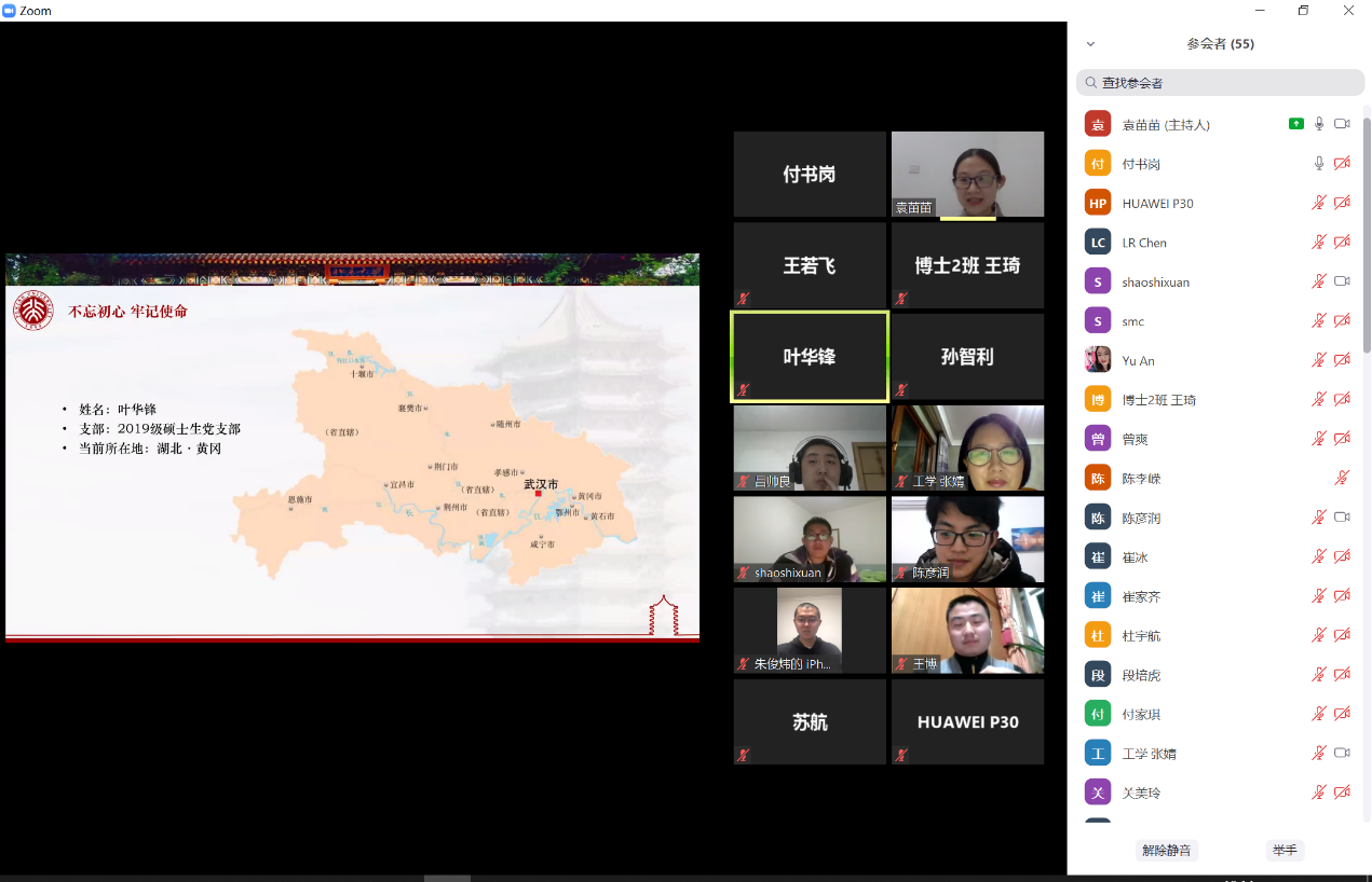 随后,目前正身处于湖北黄冈的william威廉中文官网2019级硕士生党支部书记叶华锋同学与大家分享了他在疫情期间的见闻。叶华锋讲到湖北的疫情正在逐步向好的态势发展,这离不开广大党员干部日夜坚守在工作岗位上的无私奉献。叶华锋的父亲就是一名基层公务员。自疫情发生以来,叶华锋的父亲与同事一直轮流值守在交通卡点上,每天三班倒的工作强度和艰苦的严寒环境都没有让他们产生畏难退却的心理。社区的工作人员也尽职尽责地为居民提供便利服务,努力做好入户测量体温、配送物资等工作。正是在所有人的共同努力下,疫情才能以较快的速度得到控制,也相信湖北和中国终将迎来打赢防疫战斗胜利的一天。