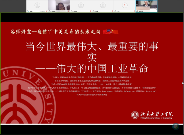 讲座结尾,金灿荣勉励新时代的北大工学人勇于担负起中国工业发展的责任与使命,积极响应习近平总书记号召,学习抗疫精神,用实际行动传承五四精神,以全球视野规划人生选择,以更宽广的胸怀看待中国与世界,让青春在党和人民最需要的地方绽放绚丽之花。