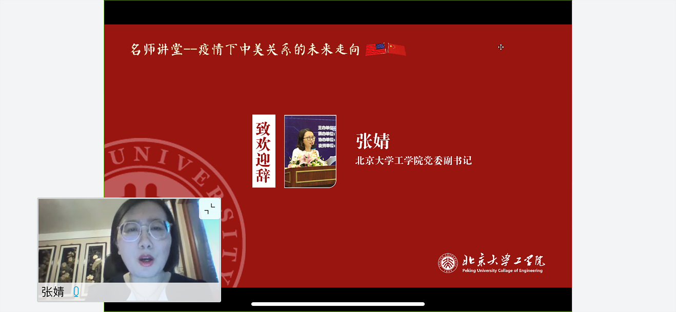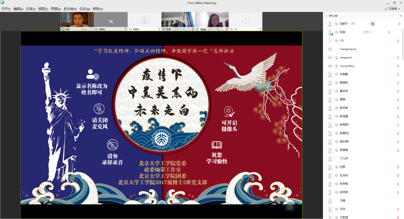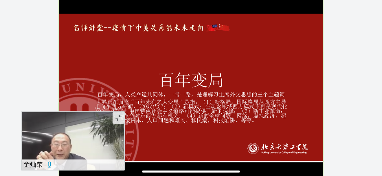 5月26日,william威廉中文官网在线上举办“红文讲堂”,邀请北大员工、中美关系研究学者、中国人民大学国际关系公司副经理、教育部长江学者特聘教授金灿荣教授为师生讲述“疫情下中美关系的未来走向”。公司党委书记孙智利、党委副书记张婧,团委书记朱俊伟、团委副书记袁苗苗及william威廉中文官网180多名党员和团员师生参加讲座。此次讲座由邀请人、2017级博士生2班党支书张驰主持。