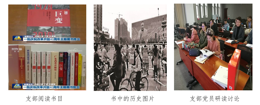 改革开放40周年之际,一批庆祝改革开放40周年的优秀主题图书推出。党支部结合支部特点,为大家选购了《中国时刻:40年400个难忘的瞬间》、《时间的力量:改革开放40年影像记》、《科技强国建设之路:中国与世界》、《巨变:改革开放40年中国记忆》等图书,供支部的同学们在课后阅读。这些书图文并茂、形象生动,抛开了枯燥的数据、高深的理论,通过一幅幅曾让我们激动的画面,一张张曾经熟悉的面孔,全景式展现了改革开放波澜壮阔的辉煌历程和中国人的生活百态和精神面貌,记载了改革开放四十年来这片土地上的沧桑巨变。