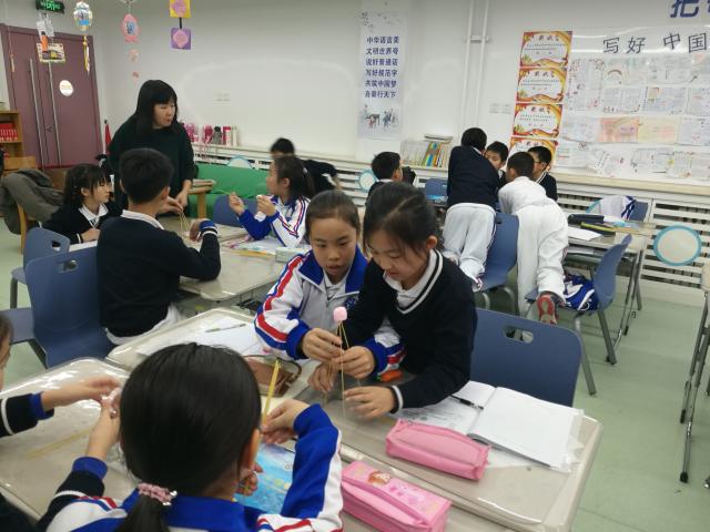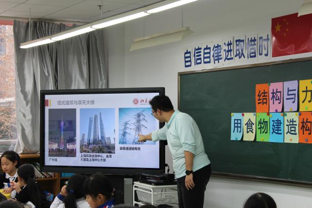 在五年级,本科生联合党支部的吴显达、叶宇晨分别为两个班级讲授了“结构与力:用食物搭建构筑物”主题科普实践课。他们以改革开放40年来我国大型建筑为切入点,分别从力学结构的角度,解析了东方明珠、广州塔等著名大型构筑物与建筑物的力学特性和设计合理性,展现了结构力学和材料力学等理论在大型建筑中的应用。两位主讲人还分析了完成一项工程的实际案例,引导同学们思考复杂的内外因素对工程建设的影响,引导同学们用系统思维进行思考。