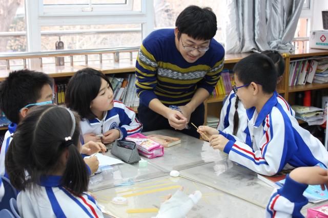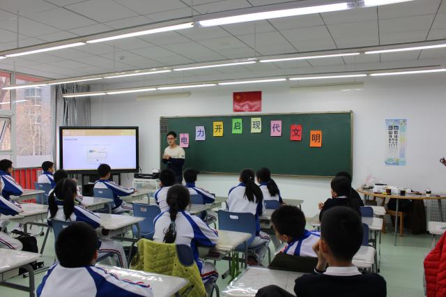 同学们依据年级和知识点掌握的程度被分成两组,分别由两个员工党支部团队带领。2017级博士生1班党支部邓伟以“电力开启现代文明”为主题,为六年级同学授课。他先向大家展示了改革开放40年来我国在电力与能源工业上取得的巨大成就。西电东送、特高压输变电工程、海上巨型风电机等大型工程的图文介绍令同学们发出阵阵惊叹。邓伟告诉同学们,电力工业极大地改变了人们的生产生活模式,开启了现代文明,也为人工智能、大数据等新兴产业提供不竭动力。