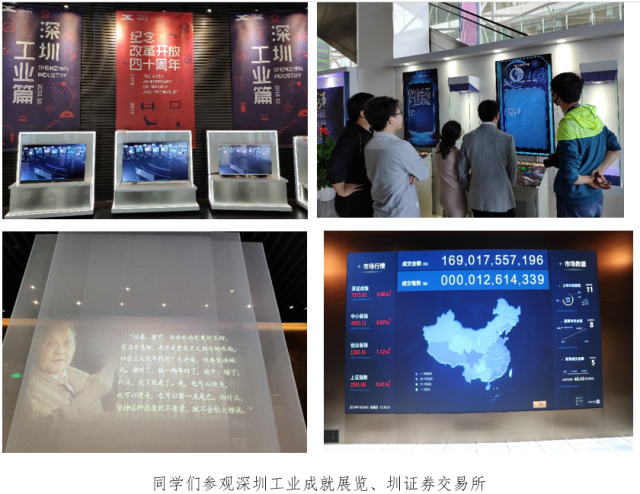 下午,同学们来到深圳工业展览馆参观,展览馆结合深圳40年来的工业发展,带领同学们回顾了深圳工业的成长历程,丰富的内容,详实的介绍,激起了实践团成员对40年历史的强烈兴趣,也坚定着自己以“工”报国的信念。随后,同学们前往深圳证券交易所参观,跟随讲解员的步伐,同学们认真参观和学习了世界历史上农业—航海—工业—科技时代不同的资本形态和演变轨迹,《晚清资本》短片带领同学们回顾了中国近代资本市场是如何在艰难中拉开帷幕,《南方谈话》和《深圳交易所》则帮助同学们了解了深圳证券交易所的诞生背景以及为我国经济体制改革和社会主义建设作出的卓越贡献。参观结束,大家不仅对深圳改革开放四十年来的金融创新之路感到骄傲自豪,更对我国资本市场的发展前景和深圳的综合竞争力充满信心。