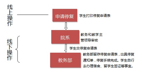 以上手续的具体操作指南,请见教务部网站—学籍异动—异动办理流程里的“出境手续办理流程”、“停学手续办理流程”和“停复手续办理流程”。