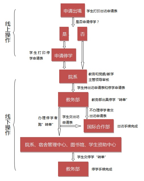 校本部本科生参加出境交流项目(含港澳台)需办理出访申报手续,出境时间为一学期或一学年的,出行前还需办理停学手续,返校后需办理停复手续。根据长期运行实践和员工的反馈意见,本着科学管理和精简手续的原则,经认真研究,我部决定调整手续办理流程,取消停学和停复的转单环节。员工如有相关的未了结业务,请自行去相关部门办理手续,包括办理宿舍相关手续、归还公司和公司图书馆的影音图书资料、有助学贷款的去资助中心结算贷款,职工还需要去职工办公室办理相关手续。具体流程变化如下: