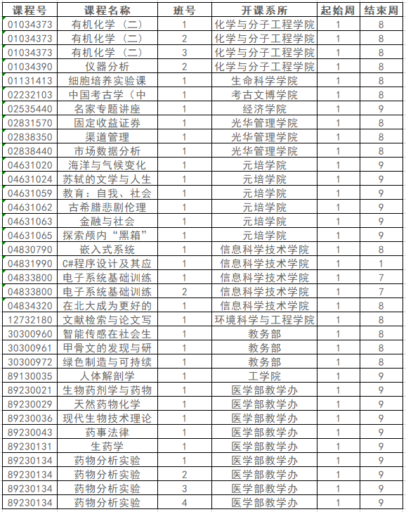 2.第10周之前已经结束的课程不进行中期退课,具体本学期有如下课程: